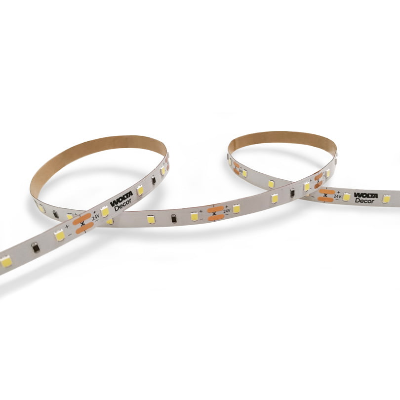 Декоративная светодиодная лента WOLTA®Decor cерии WLS представляет собой современный LED-модуль на гибкой печатной (монтажной) плате, на которой равноудалённо друг от друга расположены мощные светодиоды. Ширина ленты составляет 8-10 миллиметров (в зависимости от модели), а ее толщина со светодиодами 1-2 миллиметра. При изготовлении лента сматывается в катушку длиной 5 метров. Для ограничения подачи тока через наши светодиоды в электрическую схему WLS введены балластные сопротивления (резисторы), которые размещены на самой ленте.